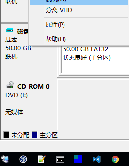 在计算机管理中打开磁盘管理,附加上刚才的虚拟磁盘,以MBR格式初化格式化成Fat32格式,然后分离磁盘。