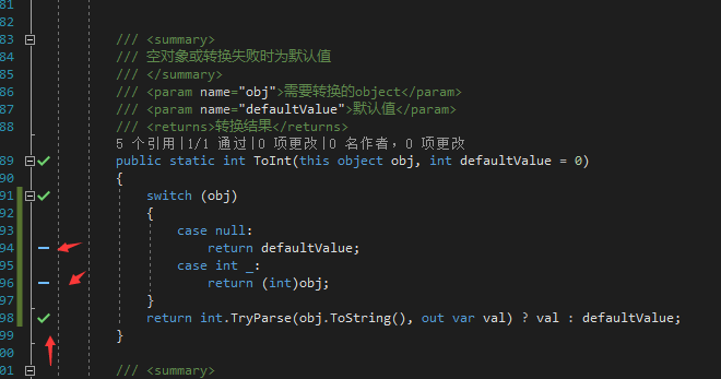 然后,转到被调函数,会发现,覆盖到的代码行会有对号,未覆盖到的是 - 一目了然呀~~~